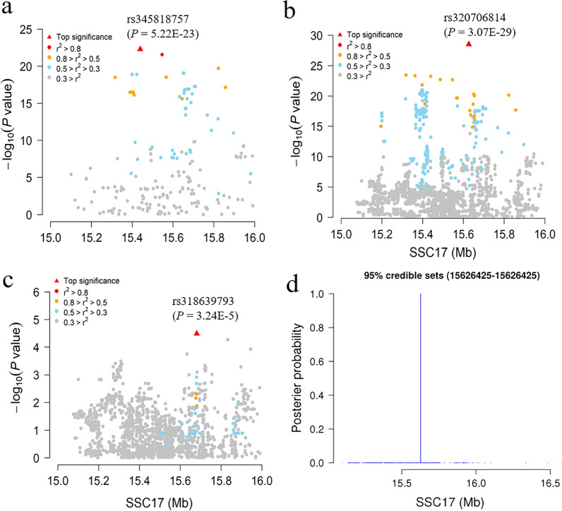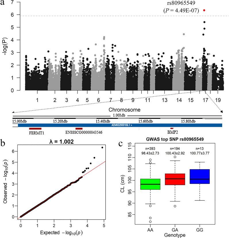 Conclusions: Taken together, these results suggest that the rs320706814 SNP on pig chromosome 17 is a putative causal mutation for carcass length in the widely used DLY pigs and has great value in breeding for body size in pigs.