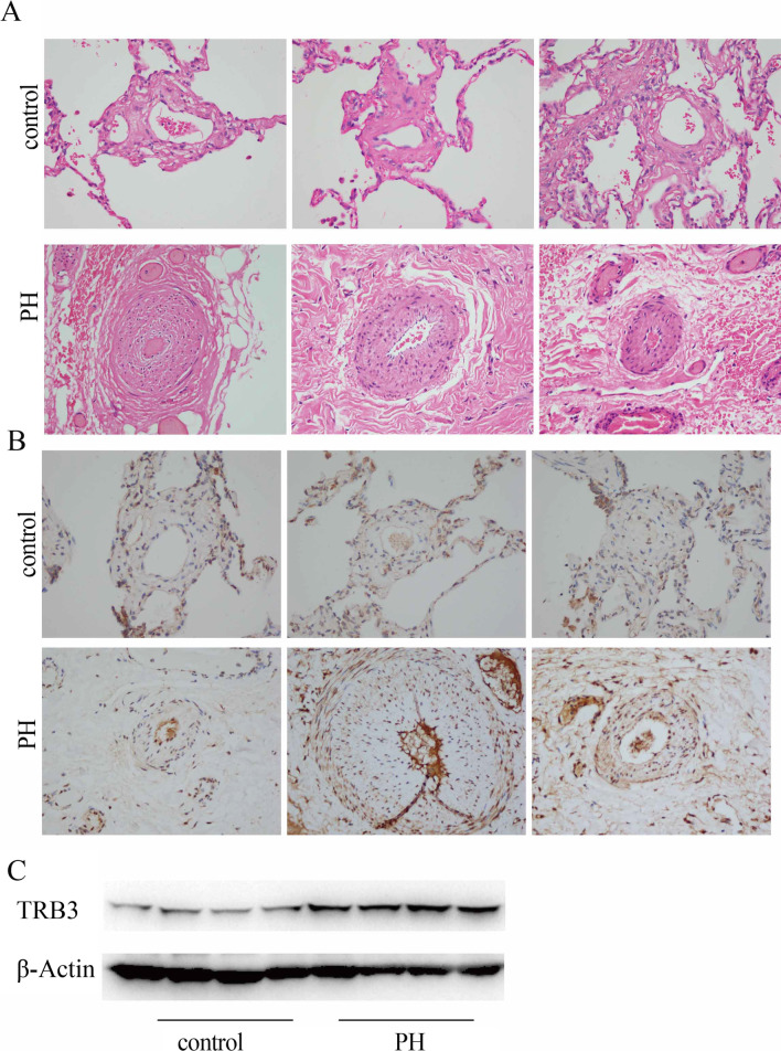 Methods: We performed studies using TRB3-specific silencing and overexpressing lentiviral vectors to investigate the potential roles of TRB3 on hypoxic pulmonary artery smooth muscle cells (PASMCs). Adeno-associated virus type 1(AVV1) vectors encoding short-hairpin RNAs against rat TRB3 were used to assess the role of TRB3 on hypoxic PH. TRB3 protein expression in PH patients was explored in clinical samples by western blot analysis.