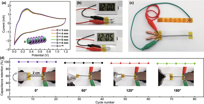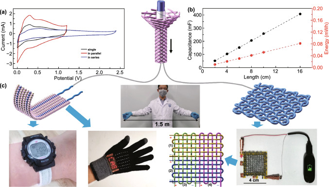 Ti3C2Tx MXene-based coaxial zinc-ion hybrid fiber supercapacitors (FSCs) were fabricated with braided structure, which can be prepared continuously and present excellent flexibility and ultrastability. A sports watch driven by the watch belts which weaved uses the obtained zinc-ion hybrid FSC and LED arrays lighted by the FSCs under embedding into textiles, demonstrating the great potential application in smart wearable textiles. Zinc-ion hybrid fiber supercapacitors (FSCs) are promising energy storages for wearable electronics owing to their high energy density, good flexibility, and weavability. However, it is still a critical challenge to optimize the structure of the designed FSC to improve energy density and realize the continuous fabrication of super-long FSCs. Herein, we propose a braided coaxial zinc-ion hybrid FSC with several meters of Ti3C2Tx MXene cathode as core electrodes, and shell zinc fiber anode was braided on the surface of the Ti3C2Tx MXene fibers across the solid electrolytes. According to the simulated results using ANSYS Maxwell software, the braided structures revealed a higher capacitance compared to the spring-like structures. The resulting FSCs exhibited a high areal capacitance of 214 mF cm-2, the energy density of 42.8 μWh cm-2 at 5 mV s-1, and excellent cycling stability with 83.58% capacity retention after 5000 cycles. The coaxial FSC was tied several kinds of knots, proving a shape-controllable fiber energy storage. Furthermore, the knitted FSC showed superior stability and weavability, which can be woven into watch belts or embedded into textiles to power smart watches and LED arrays for a few days.