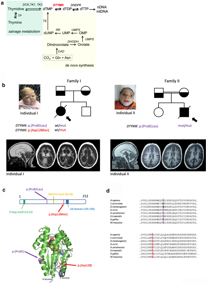 Nucleotide metabolism is a complex pathway regulating crucial cellular processes such as nucleic acid synthesis, DNA repair and proliferation. This study shows that impairment of the biosynthesis of one of the building blocks of DNA, dTTP, causes a severe, early-onset neurodegenerative disease. Here, we describe two unrelated children with bi-allelic variants in DTYMK, encoding dTMPK, which catalyzes the penultimate step in dTTP biosynthesis. The affected children show severe microcephaly and growth retardation with minimal neurodevelopment. Brain imaging revealed severe cerebral atrophy and disappearance of the basal ganglia. In cells of affected individuals, dTMPK enzyme activity was minimal, along with impaired DNA replication. In addition, we generated dtymk mutant zebrafish that replicate this phenotype of microcephaly, neuronal cell death and early lethality. An increase of ribonucleotide incorporation in the genome as well as impaired responses to DNA damage were observed in dtymk mutant zebrafish, providing novel pathophysiological insights. It is highly remarkable that this deficiency is viable as an essential component for DNA cannot be generated, since the metabolic pathway for dTTP synthesis is completely blocked. In summary, by combining genetic and biochemical approaches in multiple models we identified loss-of-function of DTYMK as the cause of a severe postnatal neurodegenerative disease and highlight the essential nature of dTTP synthesis in the maintenance of genome stability and neuronal survival.