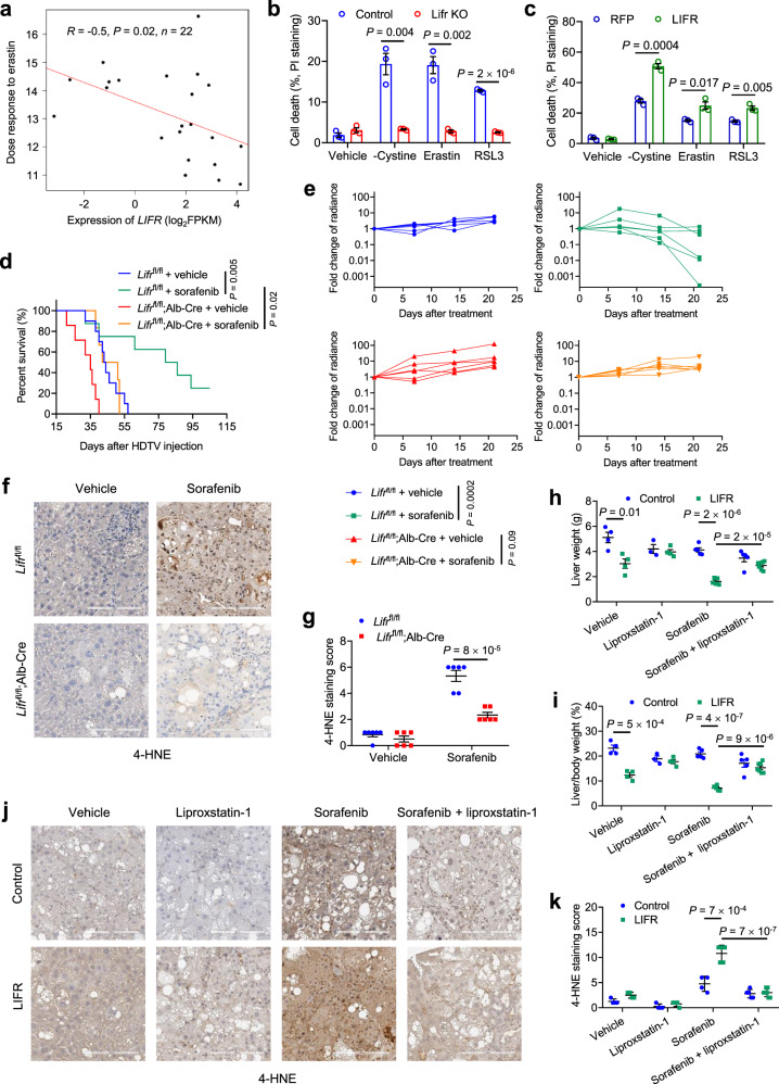 The growing knowledge of ferroptosis has suggested the role and therapeutic potential of ferroptosis in cancer, but has not been translated into effective therapy. Liver cancer, primarily hepatocellular carcinoma (HCC), is highly lethal with limited treatment options. LIFR is frequently downregulated in HCC. Here, by studying hepatocyte-specific and inducible Lifr-knockout mice, we show that loss of Lifr promotes liver tumorigenesis and confers resistance to drug-induced ferroptosis. Mechanistically, loss of LIFR activates NF-κB signaling through SHP1, leading to upregulation of the iron-sequestering cytokine LCN2, which depletes iron and renders insensitivity to ferroptosis inducers. Notably, an LCN2-neutralizing antibody enhances the ferroptosis-inducing and anticancer effects of sorafenib on HCC patient-derived xenograft tumors with low LIFR expression and high LCN2 expression. Thus, anti-LCN2 therapy is a promising way to improve liver cancer treatment by targeting ferroptosis.