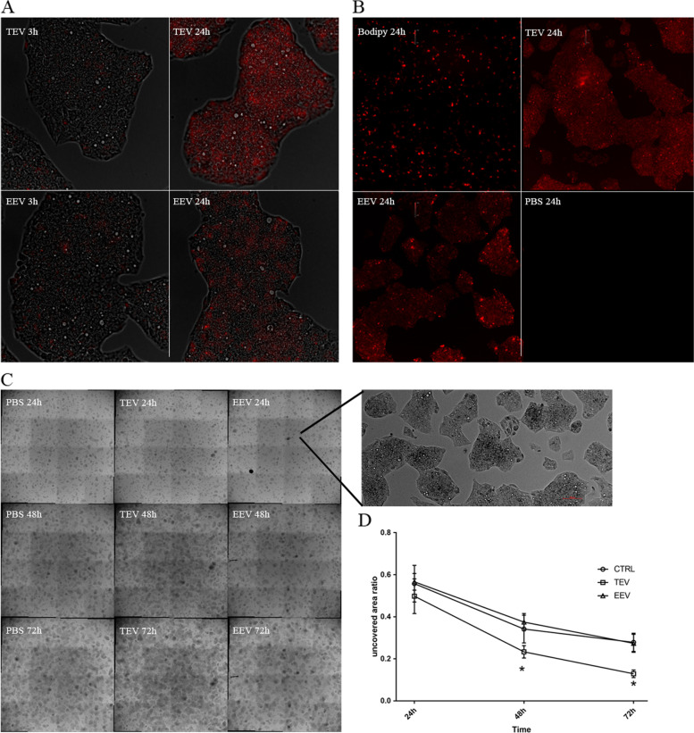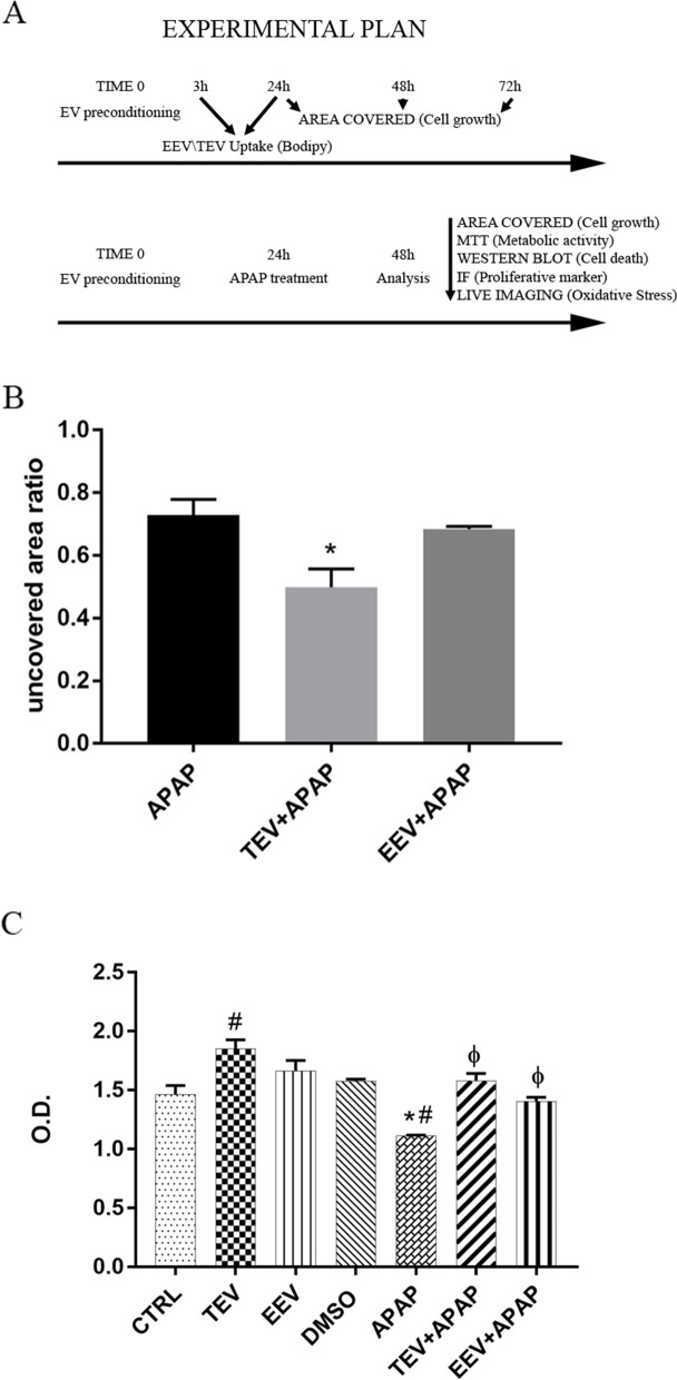 Methods: Extracellular vesicles were isolated from porcine lyophilized liver using polymer-based precipitation and a further enrichment was performed using affinity beads. The effects of obtained fractions, total extracellular vesicles and enriched extracellular vesicles, were assessed on human liver derived HepG2 cells. Cell growth and survival were tested, with MTT and area coverage analysis designed by us, as well as protein expression, with immunofluorescence and Western blot. Oxidative stress in live cells was also measured with fluorogenic probes.