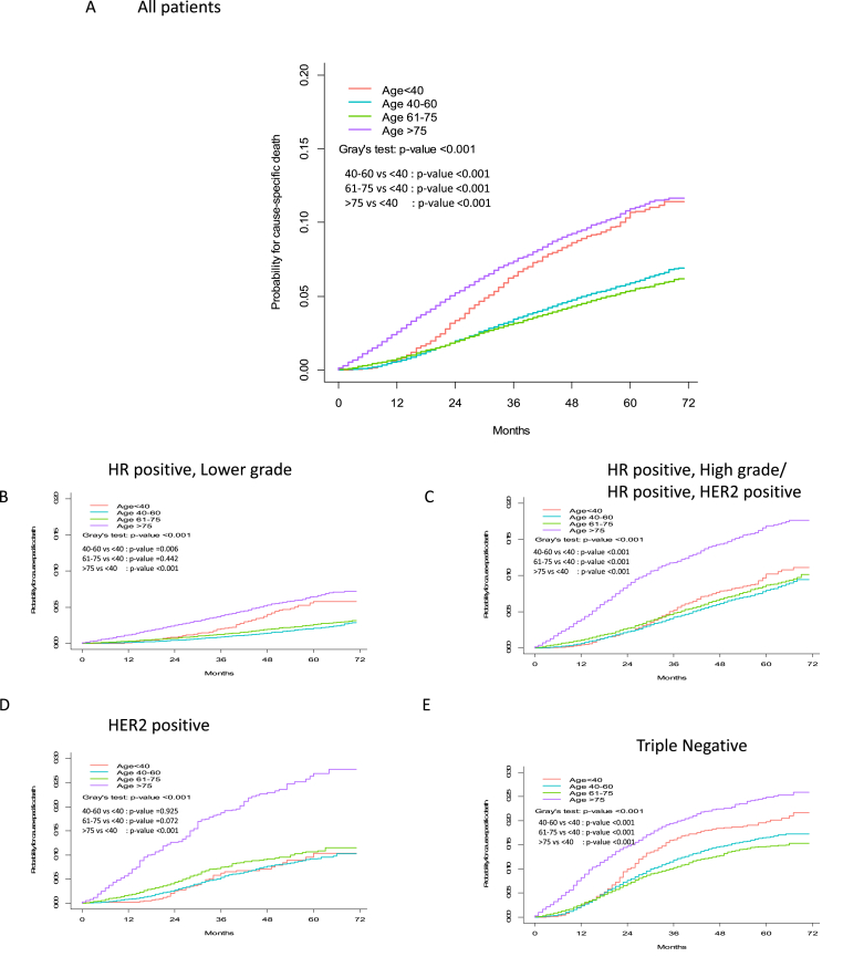 Methods: Using the Surveillance, Epidemiology, and End Results (SEER) Program, we examined data for 271,173 women with stage I-III breast cancer between 2010 and 2015. Using Fine and Gray regression models to account for competing risks, we examined the risk of breast cancer-specific death by age and clinical subtypes, considering grade, hormone receptor (HR) and HER2 status, adjusting for demographic, clinical and treatment variables.