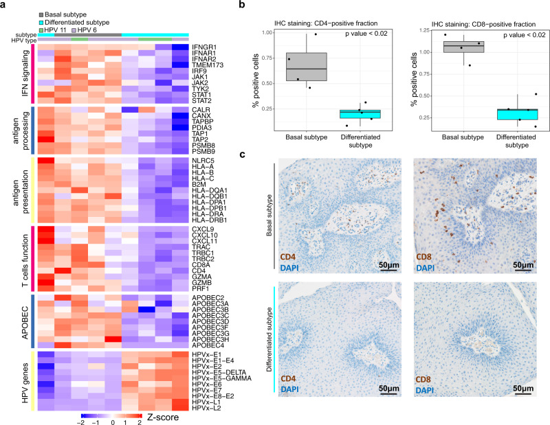 Recurrent respiratory papillomatosis (RRP) is a debilitating neoplastic disorder of the upper aerodigestive tract caused by chronic infection with low-risk human papillomavirus types 6 or 11. Patients with severe RRP can require hundreds of lifetime surgeries to control their disease and pulmonary papillomatosis can be fatal. Here we report the comprehensive genomic and transcriptomic characterization of respiratory papillomas. We discovered and characterized distinct subtypes with transcriptional resemblance to either a basal or differentiated cell state that associate with disease aggressiveness and differ in key molecular, immune and APOBEC mutagenesis profiles. Through integrated comparison with high-risk HPV-associated head and neck squamous cell carcinoma, our analysis revealed divergent molecular and immune papilloma subtypes that form independent of underlying genomic alterations. Cumulatively our results support the development of dysregulated cellular proliferation and suppressed anti-viral immunity through distinct programs of squamous cell differentiation and associated expression of low-risk HPV genes. These analyses provide insight into the pathogenesis of respiratory papillomas and provide a foundation for the development of therapeutic strategies.