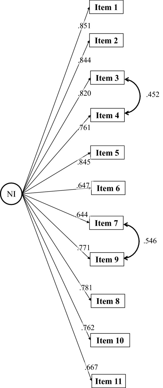 Results: A total of N = 302 participants were included. Confirmatory factor analysis (CFA) indicated that the 11-item measure is unidimensional with values of CFI, TLI, and RMSEA meeting relevant thresholds. Good internal consistency (Cronbach's α 0.941) and test-retest reliability (intra-class correlation coefficients 0.730-0.880). Convergent validity with two reference measures was demonstrated with strong correlations of 0.573-0.730 were shown. Significant differences (P = 0.0018, standardized effect size = 0.372) between groups defined by number of night-time voids supported known-groups validity. Exit interviews in 66 patients indicated all participants experienced improvement in at least 1 NI Diary item and that a 1-point improvement on the item response scale and 1-void reduction per night (associated with an average best cut point on ROC analysis of - 11.6) constituted meaningful improvement. Anchor and distribution-based analyses identified a meaningful change threshold of - 15 to - 18 points on the NI Diary.