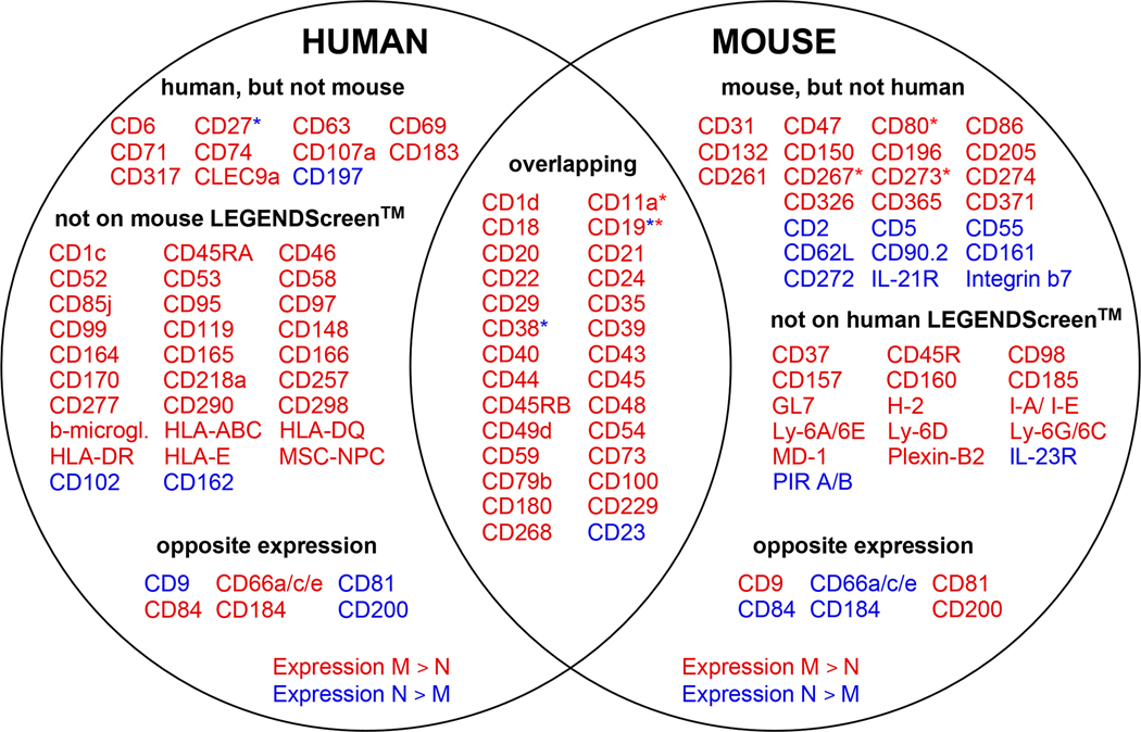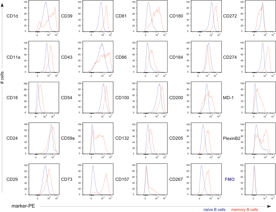 Memory B cells (MBCs) protect the body from recurring infections. MBCs differ from their naive counterparts (NBCs) in many ways, but functional and surface marker differences are poorly characterized. In addition, although mice are the prevalent model for human immunology, information is limited concerning the nature of homology in B cell compartments. To address this, we undertook an unbiased, large-scale screening of both human and mouse MBCs for their differential expression of surface markers. By correlating the expression of such markers with extensive panels of known markers in high-dimensional flow cytometry, we comprehensively identified numerous surface proteins that are differentially expressed between MBCs and NBCs. The combination of these markers allows for the identification of MBCs in humans and mice and provides insight into their functional differences. These results will greatly enhance understanding of humoral immunity and can be used to improve immune monitoring.
