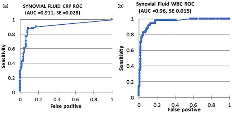 Methods: We selected synovial white cell count (SF-WCC) and C-reactive protein (SF-CRP), as they demonstrated an acceptable level of sensitivity and specificity which could be measured using existing equipment. One hundred and sixty-one synovial fluid samples from 134 patients were collected and analysed prospectively using calculated cut-off values of 10mg/l for SF-CRP and 3,000×106/l for SF-WCC. Samples were deemed positive for infection when either of the SF-CRP or SF-WCC values were above the cut-off.