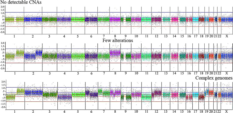 Hepatoblastoma (HB) is a rare embryonal tumor, although it is the most common pediatric liver cancer. The aim of this study was to provide an accurate cytogenomic profile of this type of cancer, for which information in cancer databases is lacking. We performed an extensive literature review of cytogenetic studies on HBs disclosing that the most frequent copy number alterations (CNAs) are gains of 1q, 2/2q, 8/8q, and 20; and losses at 1p and 4q. Furthermore, the CNA profile of a Brazilian cohort of 26 HBs was obtained by array-CGH; the most recurrent CNAs were the same as shown in the literature review. Importantly, HBs from female patients, high-risk stratification tumors, tumors who developed in older patients (> 3 years at diagnosis) or from patients with metastasis and/or deceased carried a higher diversity of chromosomal alterations, specifically chromosomal losses at 1p, 4, 11q and 18q. In addition, we distinguished three major CNA profiles: no detectable CNA, few CNAs and tumors with complex genomes. Tumors with simpler genomes exhibited a significant association with the epithelial fetal subtype of HBs; in contrast, the complex genome group included three cases with epithelial embryonal histology, as well as the only HB with HCC features. A significant association of complex HB genomes was observed with older patients who developed high-risk tumors, metastasis, and deceased. Moreover, two patients with HBs exhibiting complex genomes were born with congenital anomalies. Together, these findings suggest that a high load of CNAs, mainly chromosomal losses, particularly losses at 1p and 18, increases the tendency to HB aggressiveness. Additionally, we identified six hot-spot chromosome regions most frequently affected in the entire group: 1q31.3q42.3, 2q23.3q37.3, and 20p13p11.1 gains, besides a 5,3 Mb amplification at 2q24.2q24.3, and losses at 1p36.33p35.1, 4p14 and 4q21.22q25. An in-silico analysis using the genes mapped to these six regions revealed several enriched biological pathways such as ERK Signaling, MicroRNAs in Cancer, and the PI3K-Akt Signaling, in addition to the WNT Signaling pathway; further investigation is required to evaluate if disturbances of these pathways can contribute to HB tumorigenesis. The analyzed gene set was found to be associated with neoplasms, abnormalities of metabolism/homeostasis and liver morphology, as well as abnormal embryonic development and cytokine secretion. In conclusion, we have provided a comprehensive characterization of the spectrum of chromosomal alterations reported in HBs and identified specific genomic regions recurrently altered in a Brazilian HB group, pointing to new biological pathways, and relevant clinical associations.
