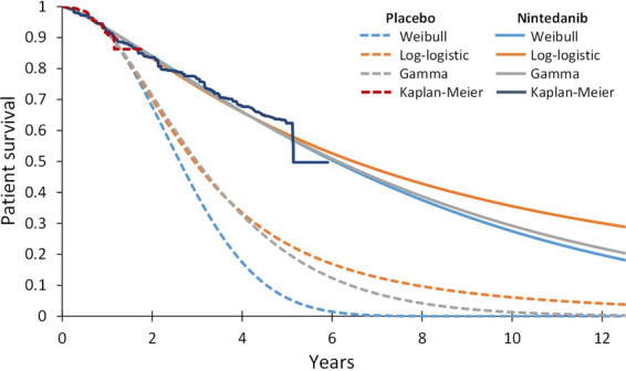 Results: After propensity score matching, the analysis included data from 1099 patients with IPF (640 nintedanib patients; 459 placebo patients) and 654 patients with other PF-ILDs (326 nintedanib patients; 328 placebo patients). Gamma, log-logistic and Weibull models best fit the survival of the matched patients with IPF. All three models led to consistent Bayesian estimates of survival for the matched patients with other PF-ILDs, with median rates of overall survival ranging from 6.34 to 6.50 years after starting nintedanib. The corresponding control group survival estimates were 3.42 to 3.76 years.