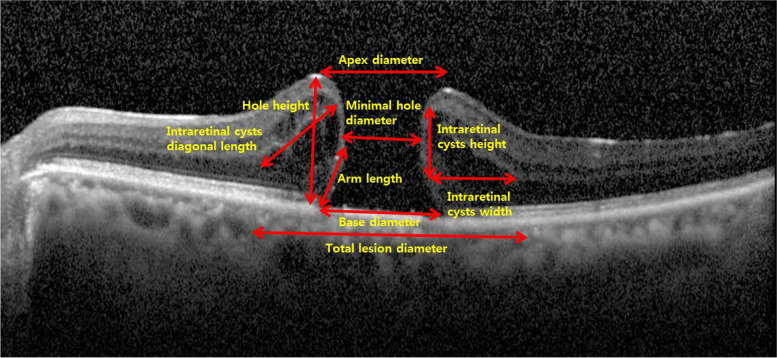 Results: Of the 35 patients, 28 (80.00%) had type 1 closure and seven (20.00%) had type 2 closure. There was a significant difference in postoperative BCVA (P < 0.01), base diameter (P = 0.037), arm length (P = 0.045), and IRC height (P = 0.011) between the two groups. In the type 1 closure, they were further divided into two subgroups according to photoreceptor damage, and it was confirmed that there were significant differences in postoperative BCVA (P = 0.045), hole height (P = 0.048), and IRC height (P = 0.046) in the two subgroups. As for the new parameters, a significant difference between the three groups was confirmed (P < 0.01).