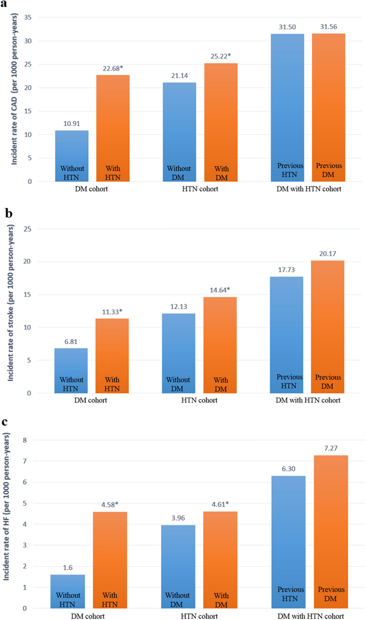 Results: The mean follow-up time of this study was 6.75 years. Mean incident rates of coronary artery disease for T2DM cohorts, HTN cohorts, and comorbid cohorts were 16.80, 23.18, and 31.53 per 1000 person-years, respectively. The adjusted hazard ratios (HRs) (95% confidence intervals [95% CIs]) for incident coronary artery disease, stroke, and heart failure in T2DM participants with versus without HTN were 2.22 (2.07-2.37), 1.19 (1.16-1.23), and 0.92 (0.82-1.02), respectively; the adjusted HRs for HTN participants with versus without T2DM were 1.69 (1.55-1.84), 1.25 (1.21-1.30), and 0.98 (0.93-1.05), respectively; the adjusted HRs for comorbid T2DM and HTN participants with previous T2DM versus previous HTN were 2.78 (2.37-3.27), 1.20 (1.13-1.28), and 0.95 (0.88-1.03), respectively.