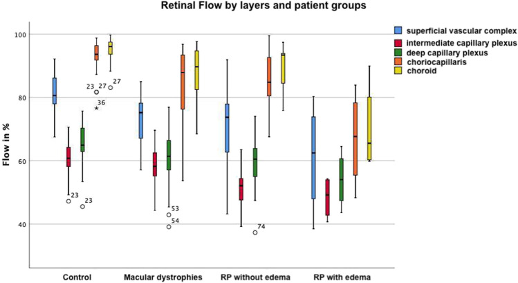 Methods: In this retrospective study, patients with MD and RP were examined by OCT-A and compared to healthy individuals. OCT-A images were analyzed regarding the diameter and surface area of the foveal avascular zone (FAZ) as well as flow (FL) in different retinal layers (superficial vascular complex (SVC), intermediate capillary complex (ICP), deep capillary complex (DCP), choriocapillaris (CC), and choroid (CD)).