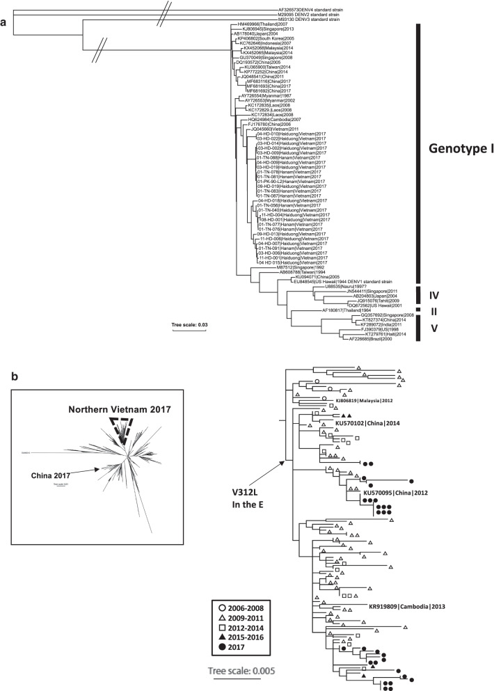 Study design: In total, 1026 blood samples were collected from patients with suspected dengue fever in Ha Nam and Hai Duong province, nearby areas of the capital of Vietnam. After screening by real-time PCR, 40 of DENV1 positive samples were subjected to whole-genome sequencing, and 28 complete coding sequences were obtained.