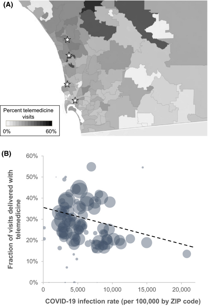 Results: Among 29,421 patient encounters over the study period, 8,541 (29%) were delivered via telemedicine. Several groups of patients were less likely to use telemedicine, including Hispanic (adjusted odds ratio [aOR] 0.86, p = 0.03), Asian (aOR 0.79, p = 0.002), Spanish-speaking (aOR 0.71, p = 0.0006), low-income (aOR 0.67, p < 0.0001), and those with Medicaid (aOR 0.66, p < 0.0001). Lower rates of telemedicine use were found in zip codes with higher rates of COVID-19 infection. Each 10% increase in COVID-19 infection rates was associated with an 8.3% decrease in telemedicine use (p = 0.002).