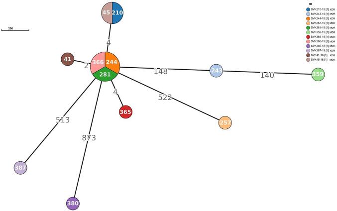 Objective: The resistance of Mycobacterium (M.) tuberculosis to antituberculosis drugs poses a major threat to global public health. Whole genome sequencing (WGS) is an increasingly preferred method in the diagnostics and monitoring of the transmission dynamics of resistant forms of tuberculosis (TB). The aim of the study was to, for the first time, use the sequencing-based analysis to study the transmission and resistance patterns of a systematic and recent collection of extensively drug resistant (XDR) and multidrug resistant tuberculosis (MDR-TB) isolates and to expand our knowledge about drug resistant (DR) TB epidemiological dynamics in Slovakia.