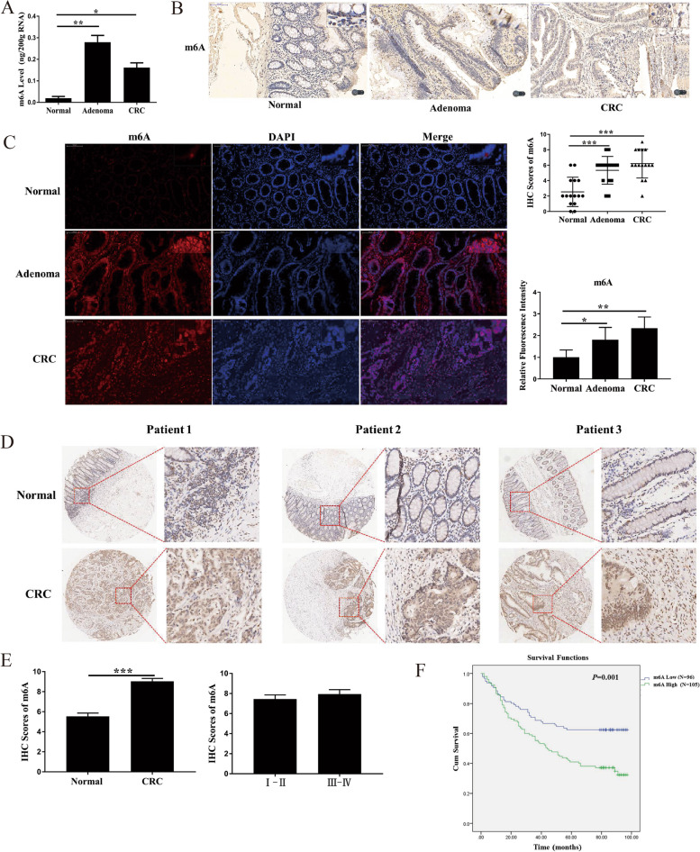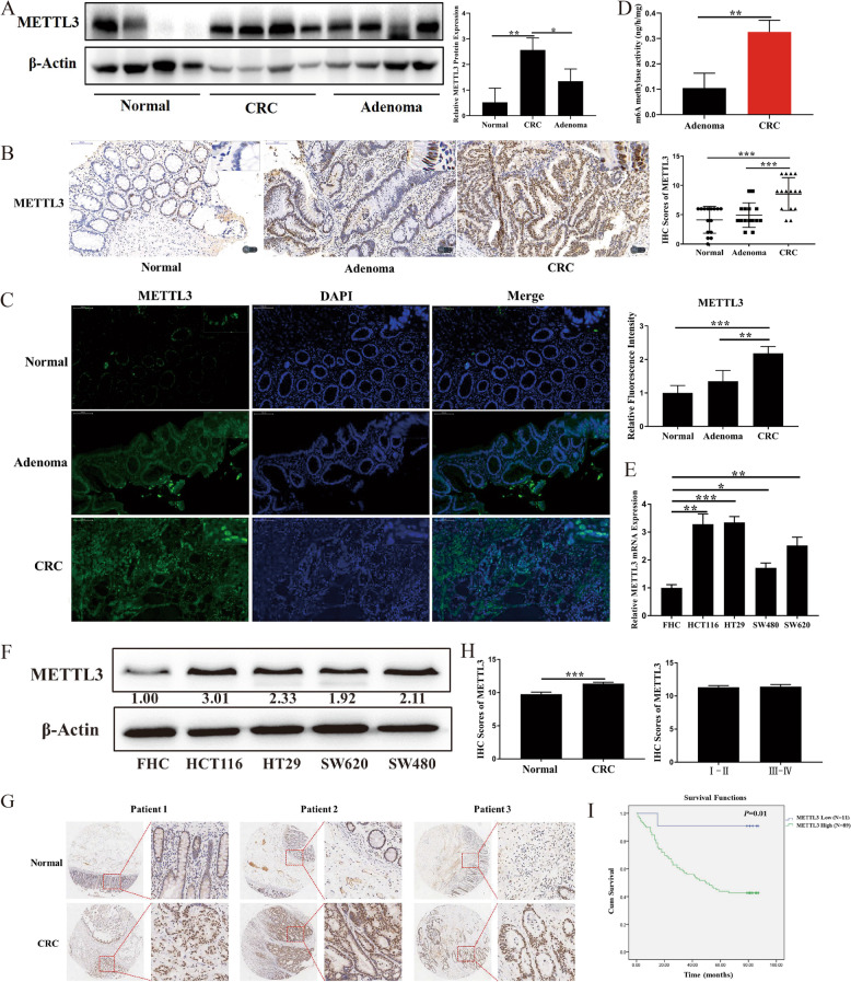 Methods: Adenoma and CRC samples were examined to detect m6A and METTL3 levels, and tissue microarrays were performed to evaluate the association of m6A and METTL3 levels with the survival of patients with CRC. The biological functions of METTL3 were investigated through cell counting kit-8, wound healing, and transwell assays. M6A epitranscriptomic microarray, methylated RNA immunoprecipitation-qPCR, RNA stability, luciferase reporter, and RNA immunoprecipitation assays were performed to explore the mechanism of METTL3 in CRC progression.