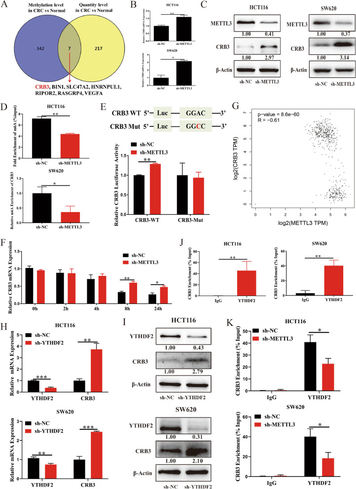 Results: M6A and METTL3 levels were substantially elevated in CRC tissues, and patients with CRC with a high m6A or METTL3 levels exhibited shorter overall survival. METTL3 knockdown substantially inhibited the proliferation, migration, and invasion of CRC cells. An m6A epitranscriptomic microarray revealed that the cell polarity regulator Crumbs3 (CRB3) was the downstream target of METTL3. METTL3 knockdown substantially reduced the m6A level of CRB3, and inhibited the degradation of CRB3 mRNA to increase CRB3 expression. Luciferase reporter assays also showed that the transcriptional level of wild-type CRB3 significantly increased after METTL3 knockdown but not its level of variation. Knockdown of YT521-B homology domain-containing family protein 2 (YTHDF2) substantially increased CRB3 expression. RNA immunoprecipitation assays also verified the direct interaction between the YTHDF2 and CRB3 mRNA, and this direct interaction was impaired after METTL3 inhibition. In addition, CRB3 knockdown significantly promoted the proliferation, migration, and invasion of CRC cells. Mechanistically, METTL3 knockdown activated the Hippo pathway and reduced nuclear localization of Yes1-associated transcriptional regulator, and the effects were reversed by CRB3 knockdown.