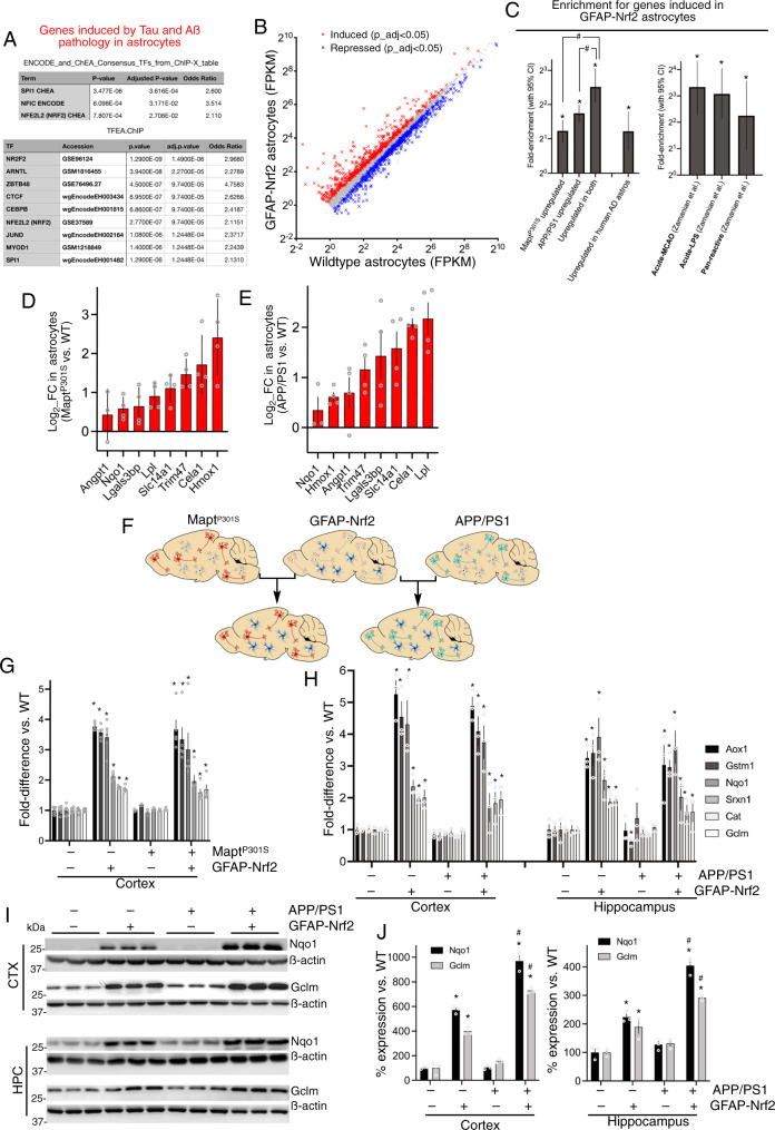 Alzheimer's disease (AD) alters astrocytes, but the effect of Aß and Tau pathology is poorly understood. TRAP-seq translatome analysis of astrocytes in APP/PS1 ß-amyloidopathy and MAPTP301S tauopathy mice revealed that only Aß influenced expression of AD risk genes, but both pathologies precociously induced age-dependent changes, and had distinct but overlapping signatures found in human post-mortem AD astrocytes. Both Aß and Tau pathology induced an astrocyte signature involving repression of bioenergetic and translation machinery, and induction of inflammation pathways plus protein degradation/proteostasis genes, the latter enriched in targets of inflammatory mediator Spi1 and stress-activated cytoprotective Nrf2. Astrocyte-specific Nrf2 expression induced a reactive phenotype which recapitulated elements of this proteostasis signature, reduced Aß deposition and phospho-tau accumulation in their respective models, and rescued brain-wide transcriptional deregulation, cellular pathology, neurodegeneration and behavioural/cognitive deficits. Thus, Aß and Tau induce overlapping astrocyte profiles associated with both deleterious and adaptive-protective signals, the latter of which can slow patho-progression.