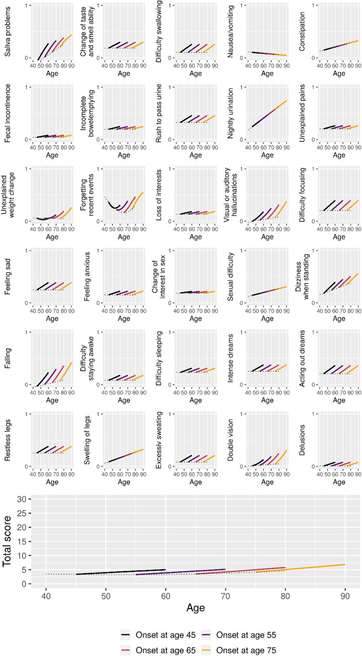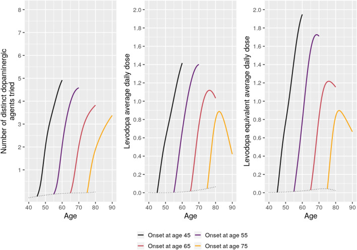 Parkinson's disease (PD) is typically considered an age-related disease, but the age at disease onset can vary by decades between patients. Aging and aging-associated diseases can affect the movement system independently of PD, and advanced age has previously been proposed to be associated with a more severe PD phenotype with accelerated progression. In this work, we investigated how interactions between PD progression and aging affect a wide range of outcomes related to PD motor and nonmotor symptoms as well as Health Related Quality of Life (HRQoL) and treatment characteristics. This population-based cohort study is based on 1436 PD patients from southern Sweden followed longitudinally for up to approximately 7.5 years from enrollment (3470 visits covering 2285 patient years, average follow-up time 1.7 years). Higher age at onset was generally associated with faster progression of motor symptoms, with a notable exception of dyskinesia and other levodopa-associated motor fluctuations that had less severe trajectories for patients with higher age at onset. Mixed results were observed for emergence of non-motor symptoms, while higher age at onset was generally associated with worse HRQoL trajectories. Accounting for these identified age-associated differences in disease progression could positively impact patient management and drug development efforts.