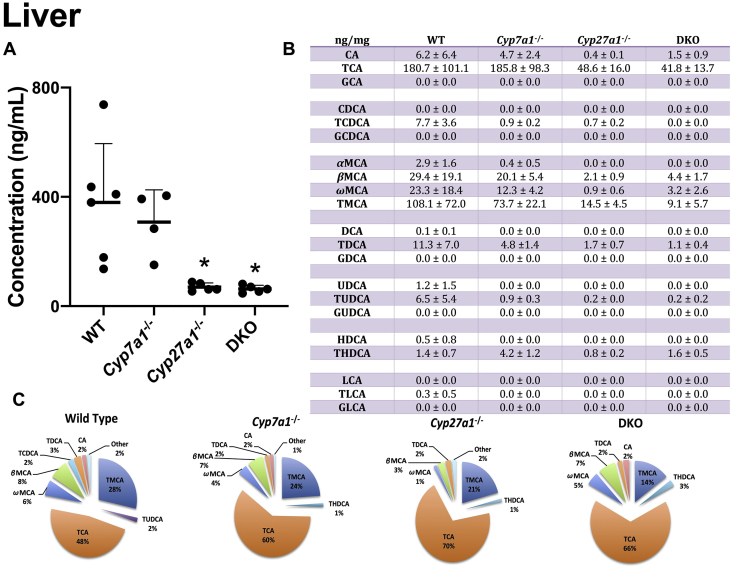 Keywords: ALP, alkaline phosphatase; ALT, alanine aminotransferase; ASBT, apical sodium-dependent BA transporter; AST, aspartate transaminase; BA, bile acid; BSEP, bile salt export pump; Bile acids; CA, cholic acid; CDCA, chenodeoxycholic acid; CYP27A1; CYP27A1, sterol 27-hydroxylase; CYP2C70, cytochrome P450 2C70; CYP7A1; CYP7A1, cholesterol 7α-hydroxylase; CYP7B1, 25-hydroxycholesterol 7-alpha-hydroxylase; CYP8B1, sterol 12α-hydroxylase; DCA, deoxycholic acid; DKO, double knockout; FXR, farnesoid X receptor; Farnesoid X receptor; Female; Fibroblast growth factor 15; IBABP, intestinal BA-binding protein; LCA, lithocholic acid; NTCP, sodium taurocholate cotransporting polypeptide; OATP, organic anion transporters; OSTα/β, organic solute transporters alpha and beta; WT, wild type; βMCA, beta muricholic acid.