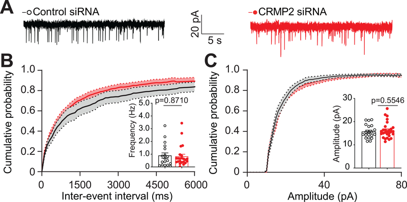 Mechanistic studies principally focusing on primary afferent nociceptive neurons uncovered the upregulation of collapsin response mediator protein 2 (CRMP2)-a dual trafficking regulator of N-type voltage-gated calcium (Cav2.2) as well as Nav1.7 voltage-gated sodium channels-as a potential determinant of neuropathic pain. Whether CRMP2 contributes to aberrant excitatory synaptic transmission underlying neuropathic pain processing after peripheral nerve injury is unknown. Here, we interrogated CRMP2's role in synaptic transmission and in the initiation or maintenance of chronic pain. In rats, short-interfering RNA-mediated knockdown of CRMP2 in the spinal cord reduced the frequency and amplitude of spontaneous excitatory postsynaptic currents, but not spontaneous inhibitory postsynaptic currents, recorded from superficial dorsal horn neurons in acute spinal cord slices. No effect was observed on miniature excitatory postsynaptic currents and inhibitory postsynaptic currents. In a complementary targeted approach, conditional knockout of CRMP2 from mouse neurons using a calcium/calmodulin-dependent protein kinase II alpha promoter to drive Cre recombinase expression reduced the frequency and amplitude of spontaneous excitatory postsynaptic currents, but not miniature excitatory SCss. Conditional knockout of CRMP2 from mouse astrocytes using a glial fibrillary acidic protein promoter had no effect on synaptic transmission. Conditional knockout of CRMP2 in neurons reversed established mechanical allodynia induced by a spared nerve injury in both male and female mice. In addition, the development of spared nerve injury-induced allodynia was also prevented in these mice. Our data strongly suggest that CRMP2 is a key regulator of glutamatergic neurotransmission driving pain signaling and that it contributes to the transition of physiological pain into pathological pain.