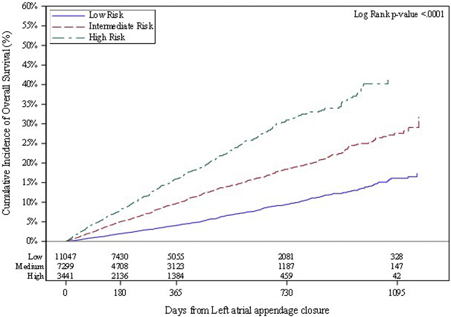 Results: Of the 21,787 patients who underwent LAAC, 10,740 (49.3%) were considered frail (HFRS >5), including 3441 (15.8%) in the high-risk group. The mortality rate (up to 1095 days) were 16.1% in the low-risk group, 26.7% in the intermediate-risk group, and 41.1% in the high-risk group (P < .001). After adjusting for age, sex, and comorbidities, HFRS >15 (compared with HFRS <5) was associated with a higher risk of long hospital stay (odds ratio [OR] 8.29; 95% confidence interval [CI] 5.94-11.57), 30-day readmission (OR 1.80, 95% CI 1.58-2.05), 30-day mortality (OR 5.68, 95% CI 3.40-9.40), and 1-year mortality (OR 2.83, 95% CI 2.39-3.35). In restricted cubic spline models, the adjusted OR for all outcomes monotonically increased with increasing HFRS.