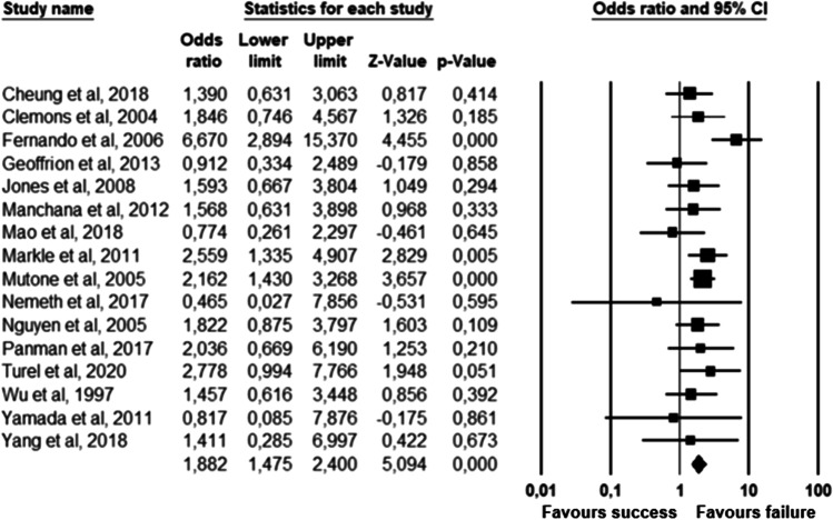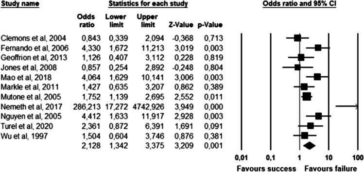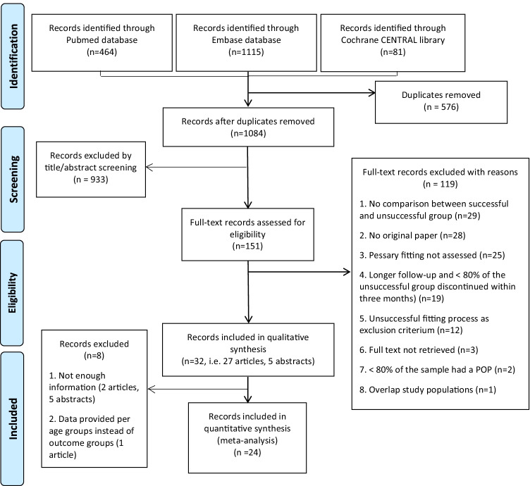 Methods: Embase, PubMed and Cochrane CENTRAL library were searched in May 2020. Inclusion criteria were: (1) pessary fitting attempted in women with symptomatic POP; (2) pessary fitting success among the study outcomes with a maximal follow-up of 3 months; (3) baseline parameters compared between successful and unsuccessful group. A meta-analysis was performed using the random effects model.
