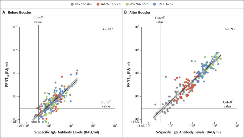 Methods: In this single-blind, multicenter, randomized, controlled trial involving health care workers who had received a priming dose of Ad26.COV2.S vaccine, we assessed immunogenicity and reactogenicity 28 days after a homologous or heterologous booster vaccination. The participants were assigned to receive no booster, an Ad26.COV2.S booster, an mRNA-1273 booster, or a BNT162b2 booster. The primary end point was the level of S-specific binding antibodies, and the secondary end points were the levels of neutralizing antibodies, S-specific T-cell responses, and reactogenicity. A post hoc analysis was performed to compare mRNA-1273 boosting with BNT162b2 boosting.