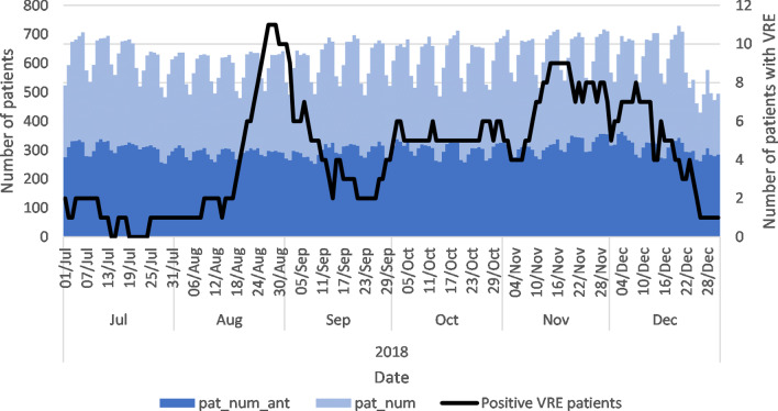 Conclusion: This study showed how the movements of patients inside hospitals and their use of antibiotics could predict the colonisation of patients with VRE at the ward level. Two daily centrality measures were proposed to summarise the flow of patients and antibiotics at the ward level. An early warning system for VRE can be developed to test and further develop infection prevention plans and outbreak strategies using these results.