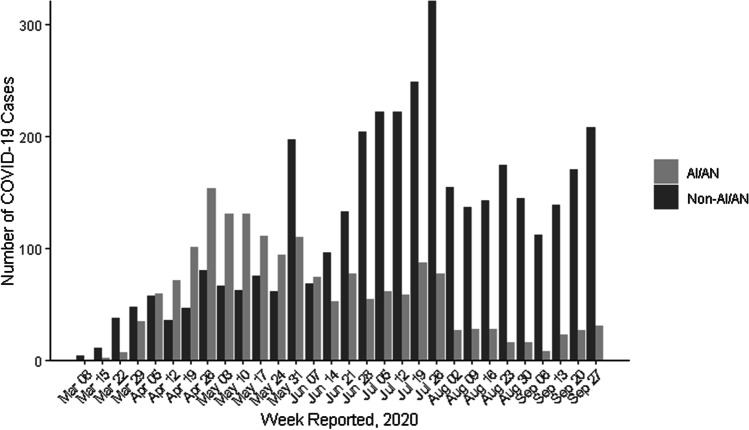 To assess the presence of racial disparity during the COVID-19 pandemic, the New Mexico Department of Health (NMDOH) sought to compare the case rate and risk of hospitalization between persons of American Indian and Alaska Native (AI/AN) race and persons of other races in New Mexico from March 1 through September 30, 2020. Using NMDOH COVID-19 surveillance data, age-standardized COVID-19 case and hospitalization risks were compared between adults (≥ 18 years old) of AI/AN and other races. We compared age, sex, and comorbidities between hospitalized adults of AI/AN and other races. Among AI/AN persons, age-standardized COVID-19 case and hospitalization risks were 3.7 (95% CI 3.6-3.8) and 10.5 (95% CI 9.8-11.2) times as high as persons of other races. Hospitalized AI/AN patients had higher proportions of diabetes mellitus (48% vs. 33%, P < 0.0001) and chronic liver disease (8% vs. 5%, P = 0.0004) compared to hospitalized patients of other races. AI/AN populations have disproportionately higher risk of COVID-19 hospitalization compared to other races in New Mexico. By identifying etiologic factors that contribute to inequity, public health partners can implement culturally appropriate health interventions to mitigate disease severity within AI/AN communities.