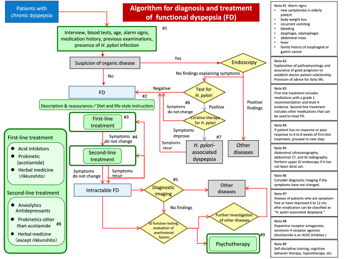 Results and conclusion: These revised guidelines have two major features. The first is the new position of endoscopy in the flow of FD diagnosis. While endoscopy was required to all cases for diagnosis of FD, the revised guidelines specify the necessity of endoscopy only in cases where organic disease is suspected. The second feature is that the drug treatment options have been changed to reflect the latest evidence. The first-line treatment includes gastric acid-secretion inhibitors, acetylcholinesterase (AChE) inhibitors (acotiamide, a prokinetic agent), and Japanese herbal medicine (rikkunshito). The second-line treatment includes anxiolytics /antidepressant, prokinetics other than acotiamide (dopamine receptor antagonists, 5-HT4 receptor agonists), and Japanese herbal medicines other than rikkunshito. The patients not responding to these treatment regimens are regarded as refractory FD.