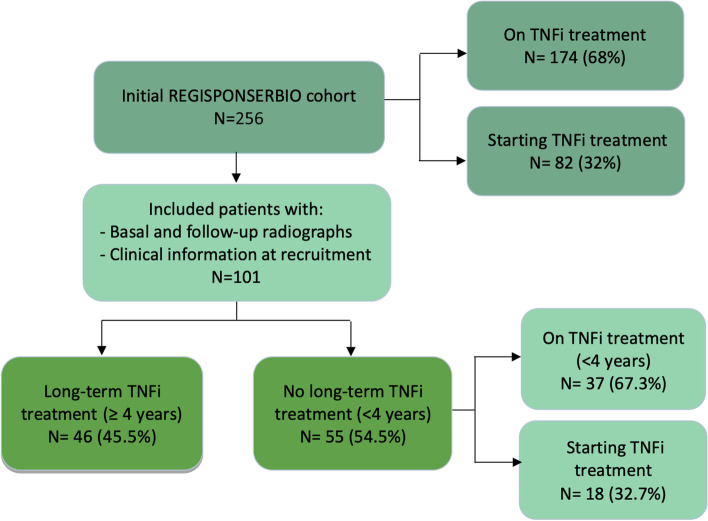Methods: The study included 101 axSpA patients from the Spanish Register of Biological Therapy in Spondyloarthritides (REGISPONSERBIO), which had clinical data and radiographic assessment available. Patients were classified into 2 groups based on the duration of TNFi treatment at baseline: (i) long-term treatment (≥4 years) and (ii) no long-term treatment (< 4 years). Radiographs were scored by two readers according to the modified Stoke Ankylosing Spondylitis Spine Score (mSASSS) with known chronology. Disease activity differences between patients' groups at each time point were assessed using a linear mixed-effect model.