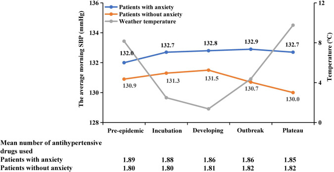 The global coronavirus disease 2019 (COVID-19) pandemic has led to a health crisis. It remains unclear how anxiety affects blood pressure (BP) and cardiovascular risk among older patients with hypertension. In this study, we extracted longitudinal data on home BP monitored via a smartphone-based application in 3724 elderly patients with hypertension from a clinical trial (60-80 years; 240 in Wuhan and 3484 in non-Wuhan areas) to examine changes in morning BP during the COVID-19 outbreak in China. Anxiety was evaluated using Generalized Anxiety Disorder-7 item scores. Changes in morning systolic BP (SBP) were analyzed for five 30-day periods during the pandemic (October 21, 2019 to March 21, 2020), including the pre-epidemic, incubation, developing, outbreak, and plateau periods. Data on cardiovascular events were prospectively collected for one year. A total of 262 individuals (7.0%) reported an increased level of anxiety, and 3462 individuals (93.0%) did not. Patients with anxiety showed higher morning SBP than patients without anxiety, and the between-group differences in SBP change were +1.2 mmHg and +1.7 mmHg during the outbreak and plateau periods (P < 0.05), respectively. The seasonal BP variation in winter among patients with anxiety was suppressed during the pandemic. Anxious patients had higher rates of uncontrolled BP. During the 1-year follow-up period, patients with anxiety had an increased risk of cardiovascular events with a hazard ratio of 2.47 (95% confidence interval, 1.10-5.58; P = 0.03). In summary, COVID-19-related anxiety was associated with a short-term increase in morning SBP among older patients and led to a greater risk of cardiovascular events. (ClinicalTrials. gov number, NCT03015311).