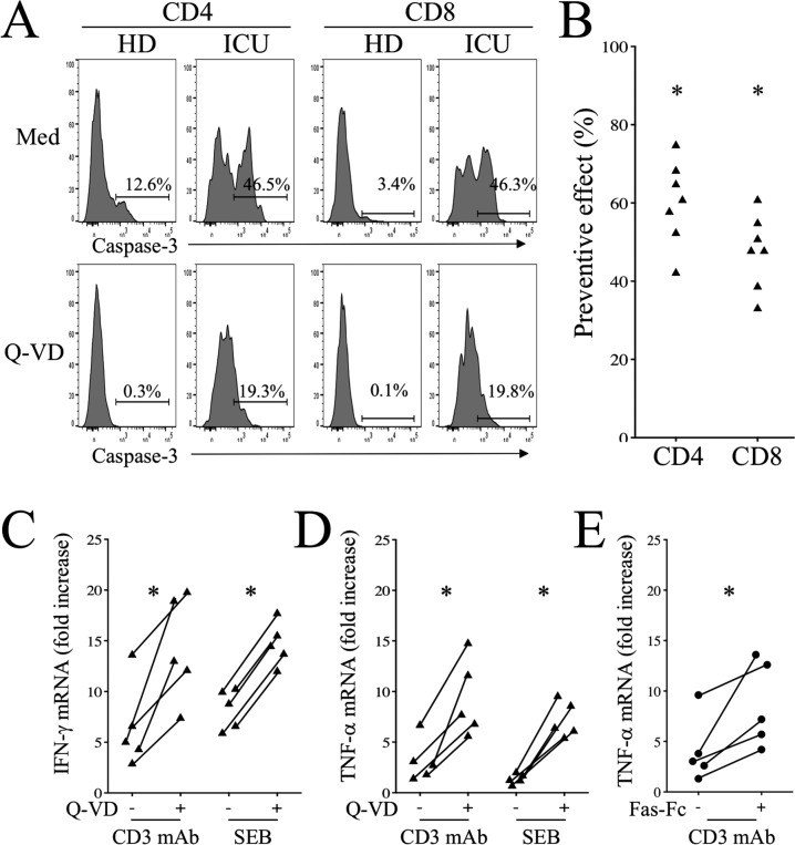 Severe SARS-CoV-2 infections are characterized by lymphopenia, but the mechanisms involved are still elusive. Based on our knowledge of HIV pathophysiology, we hypothesized that SARS-CoV-2 infection-mediated lymphopenia could also be related to T cell apoptosis. By comparing intensive care unit (ICU) and non-ICU COVID-19 patients with age-matched healthy donors, we found a strong positive correlation between plasma levels of soluble FasL (sFasL) and T cell surface expression of Fas/CD95 with the propensity of T cells to die and CD4 T cell counts. Plasma levels of sFasL and T cell death are correlated with CXCL10 which is part of the signature of 4 biomarkers of disease severity (ROC, 0.98). We also found that members of the Bcl-2 family had modulated in the T cells of COVID-19 patients. More importantly, we demonstrated that the pan-caspase inhibitor, Q-VD, prevents T cell death by apoptosis and enhances Th1 transcripts. Altogether, our results are compatible with a model in which T-cell apoptosis accounts for T lymphopenia in individuals with severe COVID-19. Therefore, a strategy aimed at blocking caspase activation could be beneficial for preventing immunodeficiency in COVID-19 patients.