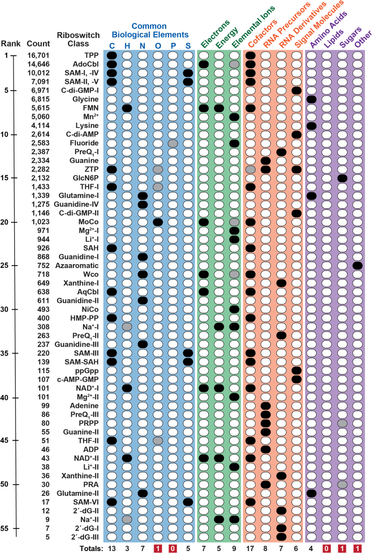 More than 55 distinct classes of riboswitches that respond to small metabolites or elemental ions have been experimentally validated to date. The ligands sensed by these riboswitches are biased in favor of fundamental compounds or ions that are likely to have been relevant to ancient forms of life, including those that might have populated the "RNA World", which is a proposed biochemical era that predates the evolutionary emergence of DNA and proteins. In the following text, I discuss the various types of ligands sensed by some of the most common riboswitches present in modern bacterial cells and consider implications for ancient biological processes centered on the proven capabilities of these RNA-based sensors. Although most major biochemical aspects of metabolism are represented by known riboswitch classes, there are striking sensory gaps in some key areas. These gaps could reveal weaknesses in the performance capabilities of RNA that might have hampered RNA World evolution, or these could highlight opportunities to discover additional riboswitch classes that sense essential metabolites.