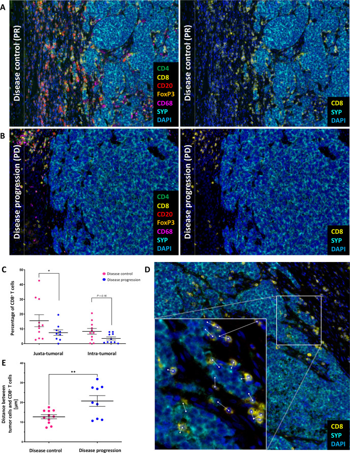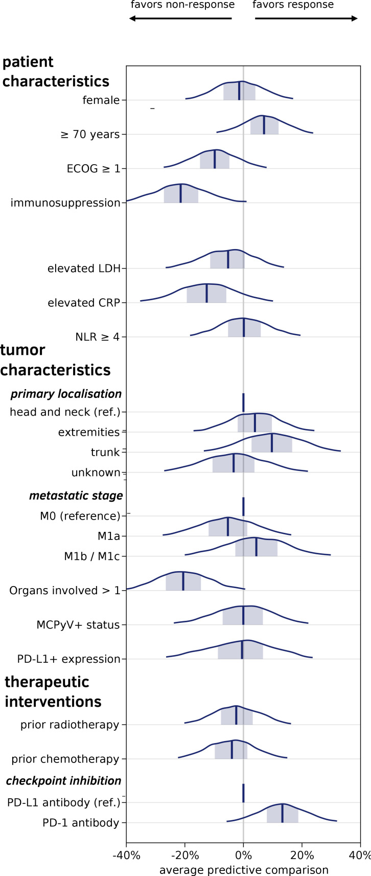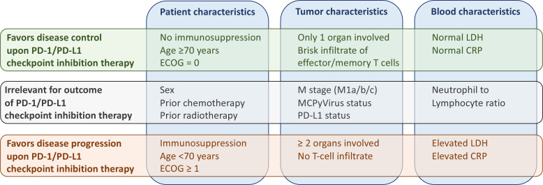 Results: Of the 114 patients, n=74 (65%) achieved disease control (BOR=complete response/partial response/stable disease) on ICI. A Bayesian cumulative ordinal regression model revealed absence of immunosuppression and a limited number of tumor-involved organ systems was highly associated with a favorable therapy response. Unimpaired overall performance status, high age, normal serum lactate dehydrogenase and normal serum C reactive protein were moderately associated with disease control. While neither tumor Merkel cell polyomavirus nor tumor PD-L1 status showed a correlation with therapy response, treatment with anti-PD-1 antibodies was associated with a higher probability of disease control than treatment with anti-PD-L1 antibodies. Multiplexed immunohistochemistry demonstrated the predominance of CD8+ effector and central memory T cells (TCM) in close proximity to tumor cells in patients with a favorable therapy response.