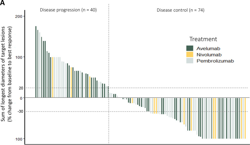 Methods: The present multicenter retrospective study investigated clinical and molecular characteristics in 114 patients with unresectable MCC at baseline before treatment with ICI for their association with therapy response (best overall response, BOR). In a subset of 21 patients, pretreatment tumor tissue was analyzed for activation, differentiation and spatial distribution of tumor infiltrating lymphocytes (TIL).