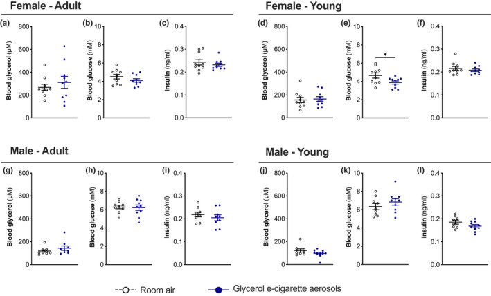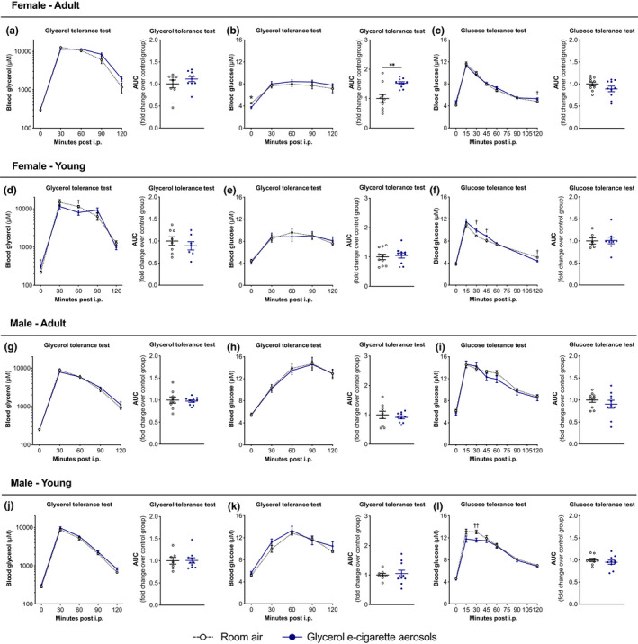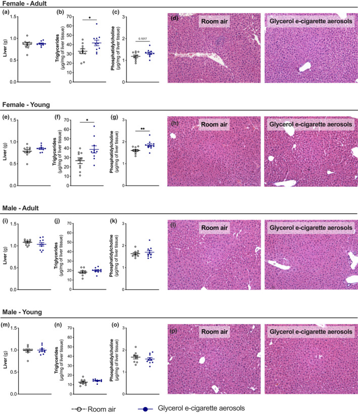 Vaping is increasingly popular among the young and adult population. Vaping liquids contained in electronic cigarettes (e-cigarettes) are mainly composed of propylene glycol and glycerol, to which nicotine and flavors are added. Among several biological processes, glycerol is a metabolic substrate used for lipid synthesis in fed state as well as glucose synthesis in fasting state. We aimed to investigate the effects of glycerol e-cigarette aerosol exposure on the aspects of glycerol and glucose homeostasis. Adult and young male and female mice were exposed to e-cigarette aerosols with glycerol as vaping liquid using an established whole-body exposure system. Mice were exposed acutely (single 2-h exposure) or chronically (2 h/day, 5 days/week for 9 weeks). Circulating glycerol and glucose levels were assessed and glycerol as well as glucose tolerance tests were performed. The liver was also investigated to assess changes in the histology, lipid content, inflammation, and stress markers. Lung functions were also assessed as well as hepatic mRNA expression of genes controlling the circadian rhythm. Acute exposure to glycerol aerosols generated by an e-cigarette increased circulating glycerol levels in female mice. Increased hepatic triglyceride and phosphatidylcholine concentrations were observed in female mice with no increase in circulating alanine aminotransferase or evidence of inflammation, fibrosis, or endoplasmic reticulum stress. Chronic exposure to glycerol e-cigarette aerosols mildly impacted glucose tolerance test in young female and male mice. Fasting glycerol, glucose, and insulin remained unchanged. Increased pulmonary resistance was observed in young male mice. Taken together, this study shows that the glycerol contained in vaping liquids can affect the liver as well as the aspects of glucose and glycerol homeostasis. Additional work is required to translate these observations to humans and determine the biological and potential pathological impacts of these findings.