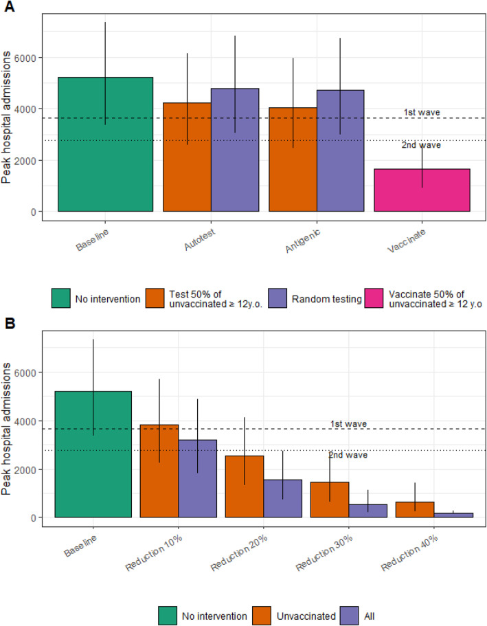 Results: In our baseline scenario characterized by basic reproduction number R0=5 and a vaccine coverage of 70-80-90% among 12-17, 18-59, and ≥ 60 years old, important stress on healthcare is expected in the absence of measures. Unvaccinated adults ≥60 years old represent 3% of the population but 43% of hospitalizations. Given limited vaccine coverage, children aged 0-17 years old represent a third of infections and are responsible for almost half of transmissions. Unvaccinated individuals have a disproportionate contribution to transmission so that measures targeting them may help maximize epidemic control while minimizing costs for society compared to non-targeted approaches. Of all the interventions considered including repeated testing and non-pharmaceutical measures, vaccination of the unvaccinated is the most effective.