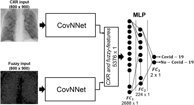 The Covid-19 pandemic is the defining global health crisis of our time. Chest X-Rays (CXR) have been an important imaging modality for assisting in the diagnosis and management of hospitalised Covid-19 patients. However, their interpretation is time intensive for radiologists. Accurate computer aided systems can facilitate early diagnosis of Covid-19 and effective triaging. In this paper, we propose a fuzzy logic based deep learning (DL) approach to differentiate between CXR images of patients with Covid-19 pneumonia and with interstitial pneumonias not related to Covid-19. The developed model here, referred to as CovNNet, is used to extract some relevant features from CXR images, combined with fuzzy images generated by a fuzzy edge detection algorithm. Experimental results show that using a combination of CXR and fuzzy features, within a deep learning approach by developing a deep network inputed to a Multilayer Perceptron (MLP), results in a higher classification performance (accuracy rate up to 81%), compared to benchmark deep learning approaches. The approach has been validated through additional datasets which are continously generated due to the spread of the virus and would help triage patients in acute settings. A permutation analysis is carried out, and a simple occlusion methodology for explaining decisions is also proposed. The proposed pipeline can be easily embedded into present clinical decision support systems.