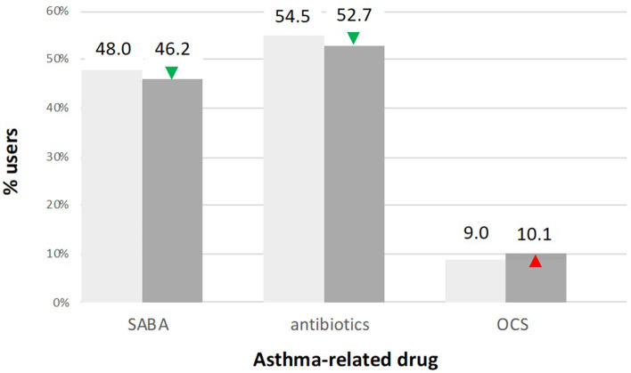 Methods: Demographics and drugs use of patients who received ICS in 2017 with or without pharmaceutical counseling were retrieved from a Belgian claims database. Asthma-related drug use from 1 year before first ICS dispensing in 2017 (reference period) was compared with 1 year after. Outcomes were usage of inhaled corticosteroids (ICS) in defined daily doses (DDD), proportion of users of short-acting beta-agonist (SABA), antibiotics, oral corticosteroids (OCS), asthma biologicals and controller-to-total (CTT) ratio.