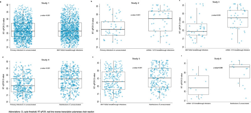 SARS-CoV-2 breakthrough infections in vaccinated individuals and in those who had a prior infection have been observed globally, but the transmission potential of these infections is unknown. The RT-qPCR cycle threshold (Ct) value is inversely correlated with viral load and culturable virus. Here, we investigate differences in RT-qPCR Ct values across Qatar's national cohorts of primary infections, reinfections, BNT162b2 (Pfizer-BioNTech) breakthrough infections, and mRNA-1273 (Moderna) breakthrough infections. Our matched-cohort analyses of the randomly diagnosed infections show higher mean Ct value in all cohorts of breakthrough infections compared to the cohort of primary infections in unvaccinated individuals. The Ct value is 1.3 (95% CI: 0.9-1.8) cycles higher for BNT162b2 breakthrough infections, 3.2 (95% CI: 1.9-4.5) cycles higher for mRNA-1273 breakthrough infections, and 4.0 (95% CI: 3.5-4.5) cycles higher for reinfections in unvaccinated individuals. Since Ct value correlates inversely with SARS-CoV-2 infectiousness, these differences imply that vaccine breakthrough infections and reinfections are less infectious than primary infections in unvaccinated individuals. Public health benefits of vaccination may have been underestimated, as COVID-19 vaccines not only protect against acquisition of infection, but also appear to protect against transmission of infection.