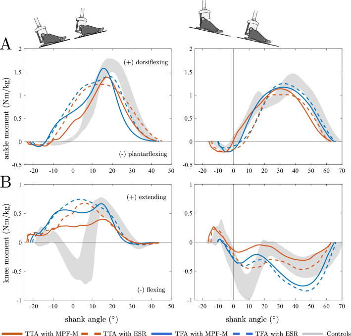 Results: Prosthetic feet- and subject group-dependent joint angle and moment characteristics were observed for both situations. The MPF showed a larger and situation-dependent ankle range of motion compared to the standard feet. Furthermore, it remained in a dorsiflexed position during swing. While ascending, the MPF adapted the dorsiflexion moment and reduced the knee extension moment. At vertical shank orientation, it reduced the knee extension moment by 26% for TFA and 49% for TTA compared to the standard feet. For descending, differences between feet in the biomechanical knee characteristics were found for the TTA group, but not for the TFA group. At the vertical shank angle during slope descent, TTA demonstrated a behavior of the ankle moment similar to able-bodied controls when using the MPF.