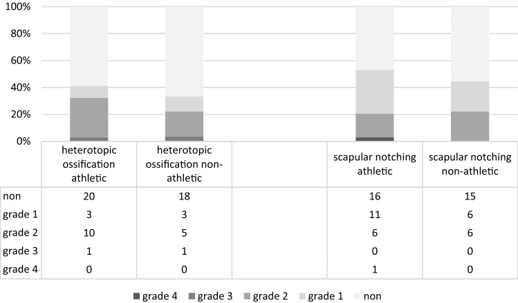 Results: Sixty-one of 71 patients (85.9%; mean age: 72.1 ± 6.6 years) were available for clinical and radiographic follow-up at a mean of 47.1 ± 18.1 months. Thirty-four patients (55.7%) were assigned to the athletic group and 27 patients (44.3%) to the non-athletic group. The athletic group demonstrated significantly better results for CS (P = 0.002), ASES score (P = 0.001), SST (P = 0.001), VAS (P = 0.022), active external rotation (P = 0.045) and abduction strength (P = 0.016) compared to the non-athletic group. The overall rate of return to sport was 78.0% at an average of 5.3 ± 3.6 months postoperatively. Incomplete radiolucent lines (RLL) around the humeral component were found significantly more frequently in the athletic group compared to the non-athletic group (P = 0.019), whereas the occurrence of complete RLLs around the implant components was similar (P = 0.382). Scapular notching was observed in 18 patients (52.9%) of the athletic group and 12 patients (44.9%) of the non-athletic group (P = 0.51). The overall rate for revision surgery was 8.2%, while postoperative complications were encountered in 3.3% of cases.
