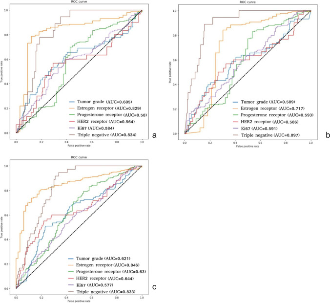 Results: In total, 447 invasive breast cancers detected on CESM with pathological evidence, in 389 patients, which represented 2460 images analysed, were included. Concerning the ER, the deep learning model on the DES images had an AUC of 0.83 with the image-by-image analysis and of 0.85 for the majority voting. For the triple-negative analysis, a high AUC was observable for all models, in particularity for the model on LE images with an AUC of 0.90 for the image-by-image analysis and 0.91 for the majority voting. The AUC for the other histoprognostic factors was lower.