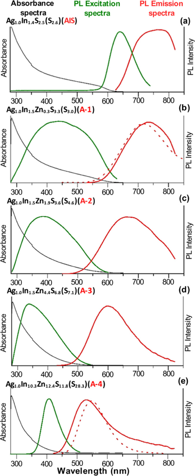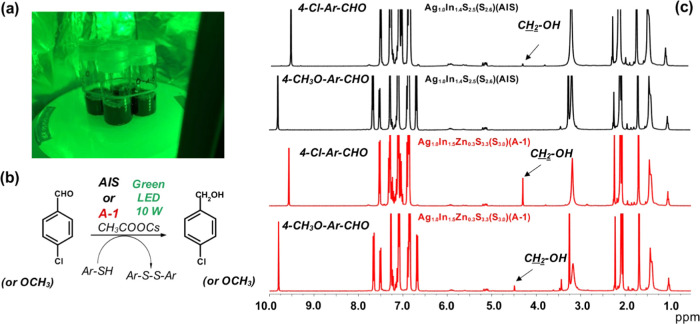A new indium precursor, namely, indium(II) chloride, was tested as a precursor in the synthesis of ternary Ag-In-S and quaternary Ag-In-Zn-S nanocrystals. This new precursor, being in fact a dimer of Cl2In-InCl2 chemical structure, is significantly more reactive than InCl3, typically used in the preparation of these types of nanocrystals. This was evidenced by carrying out comparative syntheses under the same reaction conditions using these two indium precursors in combination with the same silver (AgNO3) and zinc (zinc stearate) precursors. In particular, the use of indium(II) chloride in combination with low concentrations of the zinc precursor yielded spherical-shaped (D = 3.7-6.2 nm) Ag-In-Zn-S nanocrystals, whereas for higher concentrations of this precursor, rodlike nanoparticles (L = 9-10 nm) were obtained. In all cases, the resulting nanocrystals were enriched in indium (In/Ag = 1.5-10.3). Enhanced indium precursor conversion and formation of anisotropic, longitudinal nanoparticles were closely related to the presence of thiocarboxylic acid type of ligands in the reaction mixture. These ligands were generated in situ and subsequently bound to surfacial In(III) cations in the growing nanocrystals. The use of the new precursor of enhanced reactivity facilitated precise tuning of the photoluminescence color of the resulting nanocrystals in the spectral range from ca. 730 to 530 nm with photoluminescence quantum yield (PLQY) varying from 20 to 40%. The fabricated Ag-In-S and Ag-In-Zn-S nanocrystals exhibited the longest, reported to date, photoluminescence lifetimes of ∼9.4 and ∼1.4 μs, respectively. It was also demonstrated for the first time that ternary (Ag-In-S) and quaternary (Ag-In-Zn-S) nanocrystals could be applied as efficient photocatalysts, active under visible light (green) illumination, in the reaction of aldehydes reduction to alcohols.