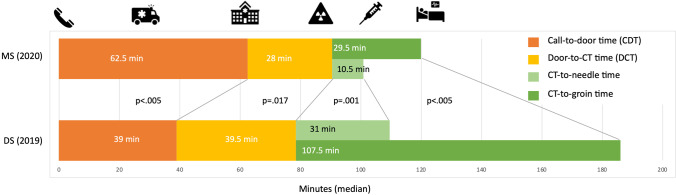 Patients and methods: All spoke-district patients treated with endovascular thrombectomy (EVT) between 15th March-15th June 2019 (drip-and-ship) and 2020 (mothership) were considered. We compared onset-to-groin time (OGT) and onset-to-needle time (ONT) between the two periods. Secondarily, we investigated other performances parameters (percentage of IV thrombolysis, timing of diagnostic and treatment) and clinical outcome (3-month modified Rankin Scale).