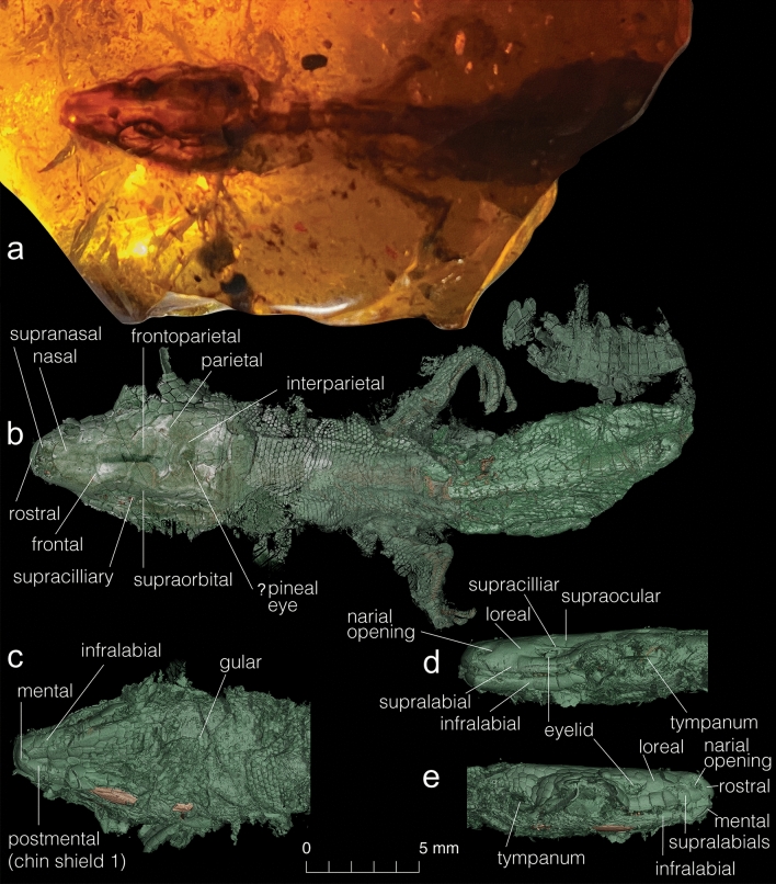 We here report on a well-preserved juvenile lizard specimen in Albian amber (ca. 110 mya) from the Hkamti site (Myanmar). This new taxon is represented by an articulated skull and the anterior portion of the trunk, including the pectoral girdle and forelimbs. The scleral ossicles and eyelid are also visible, and the specimen exhibits pristine detail of the integument (of both head and body). In a combined molecular and morphological analysis, it was consistently recovered as a scincoid lizard (Scinciformata), as sister to Tepexisaurus + Xantusiidae. However, the phylogenetic position of the new taxon should be interpreted with caution as the holotype is an immature individual. We explored the possibility of miscoding ontogenetically variable characters by running alternative analyses in which these characters were scored as missing data for our taxon. With the exception of one tree, in which it was sister to Amphisbaenia, the specimen was recovered as a Pan-xantusiid. Moreover, we cannot rule out the possibility that it represents a separate lineage of uncertain phylogenetic position, as it is the case for many Jurassic and Cretaceous taxa. Nonetheless, this fossil offers a rare opportunity to glimpse the external appearance of one group of lizards during the Early Cretaceous.