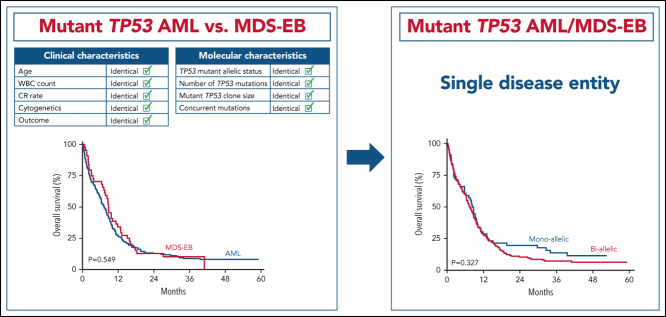 Substantial heterogeneity within mutant TP53 acute myeloid leukemia (AML) and myelodysplastic syndrome with excess of blast (MDS-EB) precludes the exact assessment of prognostic impact for individual patients. We performed in-depth clinical and molecular analysis of mutant TP53 AML and MDS-EB to dissect the molecular characteristics in detail and determine its impact on survival. We performed next-generation sequencing on 2200 AML/MDS-EB specimens and assessed the TP53 mutant allelic status (mono- or bi-allelic), the number of TP53 mutations, mutant TP53 clone size, concurrent mutations, cytogenetics, and mutant TP53 molecular minimal residual disease and studied the associations of these characteristics with overall survival. TP53 mutations were detected in 230 (10.5%) patients with AML/MDS-EB with a median variant allele frequency of 47%. Bi-allelic mutant TP53 status was observed in 174 (76%) patients. Multiple TP53 mutations were found in 49 (21%) patients. Concurrent mutations were detected in 113 (49%) patients. No significant difference in any of the aforementioned molecular characteristics of mutant TP53 was detected between AML and MDS-EB. Patients with mutant TP53 have a poor outcome (2-year overall survival, 12.8%); however, no survival difference between AML and MDS-EB was observed. Importantly, none of the molecular characteristics were significantly associated with survival in mutant TP53 AML/MDS-EB. In most patients, TP53 mutations remained detectable in complete remission by deep sequencing (73%). Detection of residual mutant TP53 was not associated with survival. Mutant TP53 AML and MDS-EB do not differ with respect to molecular characteristics and survival. Therefore, mutant TP53 AML/MDS-EB should be considered a distinct molecular disease entity.