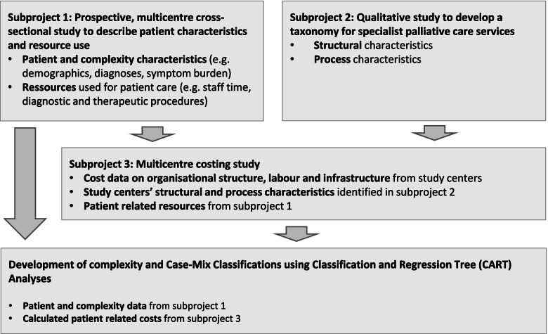 Methods: COMPANION is a mixed-methods study with data derived from three subprojects. Subproject 1: Prospective, cross-sectional multi-centre study collecting data on patients' needs which reflect the complexity of the respective patient situation, as well as data on resources that are required to meet these needs in specialist palliative care units, palliative care advisory teams, and specialist palliative home care. Subproject 2: Qualitative study including the development of a literature-based preliminary list of characteristics, expert interviews, and a focus group to develop a taxonomy for specialist palliative care models. Subproject 3: Multi-centre costing study based on resource data from subproject 1 and data of study centres. Data and results from the three subprojects will inform each other and form the basis for the development of the casemix classification. Ultimately, the casemix classification will be developed by applying Classification and Regression Tree (CART) analyses using patient and complexity data from subproject 1 and patient-related cost data from subproject 3.